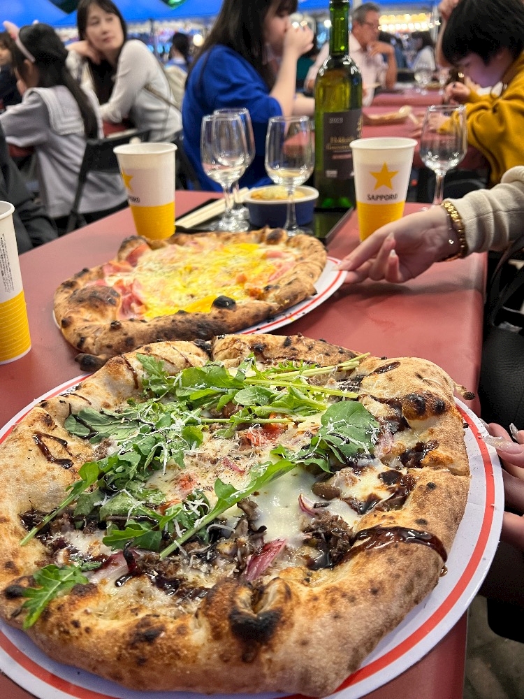 外でピザ食べながら飲むビールとワイン
