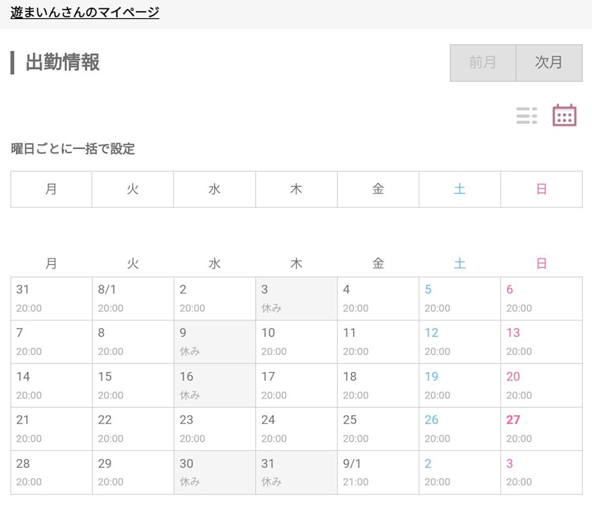 休み希望ないので意識してなかったけど、どうやら8月は水曜日会えない女だったみたいです