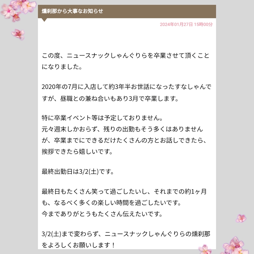 刹那ちゃん、多分残り4回ぐらいの出勤だと思われます