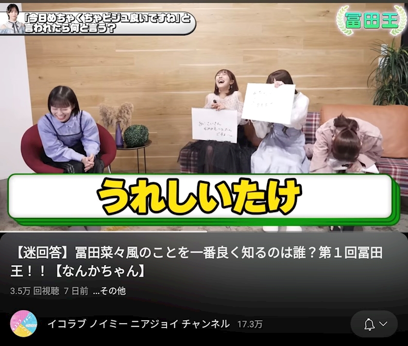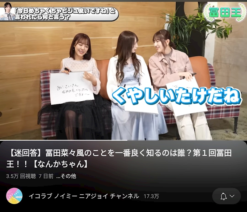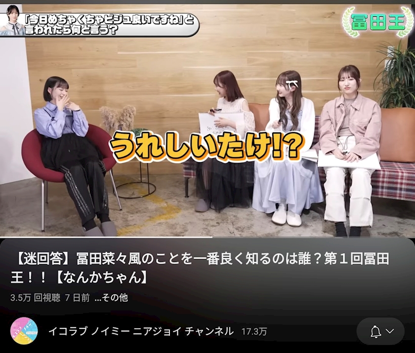 イコノイジョイの合同サブチャンネルで、冨田菜々風ちゃん(ノイミーでまいんが一番好きな子)の回答をメンバーが予想しろ!!!という企画