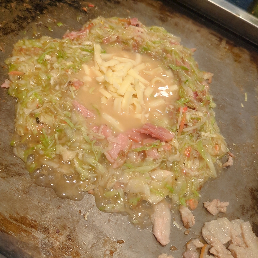 プレーンにお餅とチーズとベーコンと豚肉を加えて豪華にしました🙂↕️🙂↕️