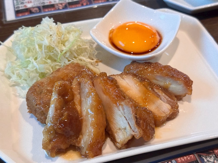 照焼きの照焼ソースがしっかり絡んでて、それを黄身に付けて食べろというなんとグレートな食べ物なんだ……