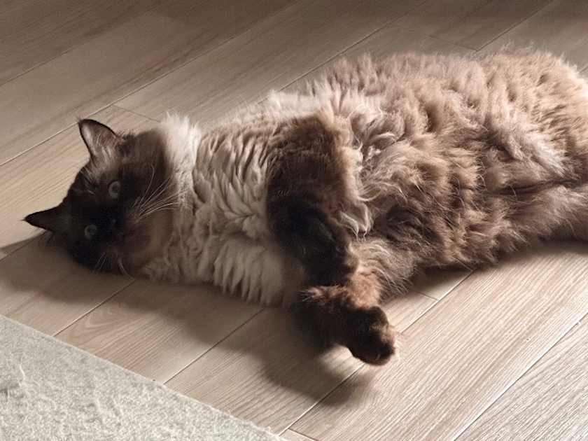 カーペットで爪を研いでいたので叱ったら、やってませんよ〜みたいな顔で見られました