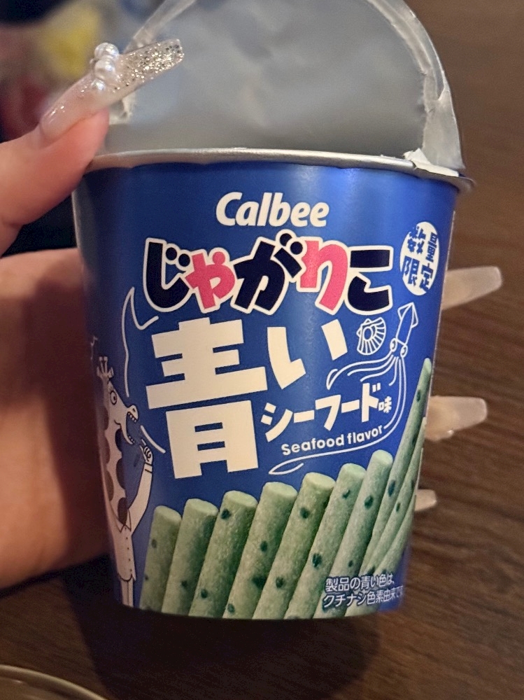 この青いじゃがりこはホタテ、アサリ、イカのエキスパウダーが入っててクラムチャウダーの味がしました!!みんなは味感じないって言ってたけど逆に私がおかしいんか……???