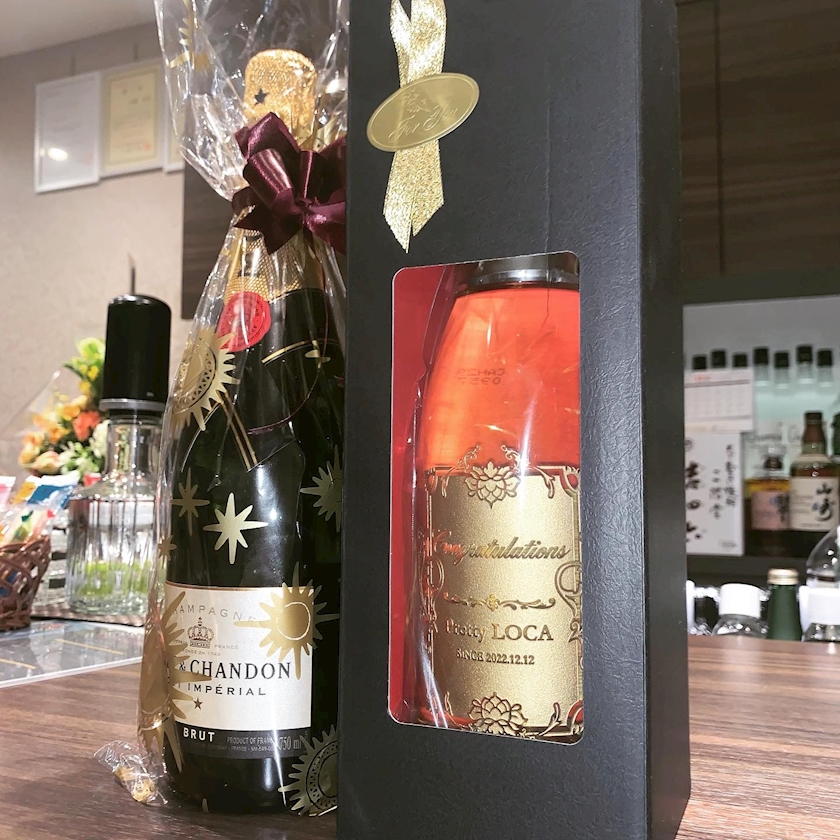 写真はお祝いで頂いたお店の名前が入ってるお酒