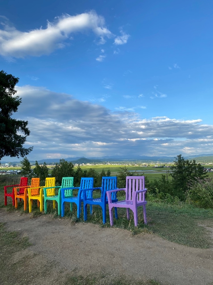 丘の上にあるカラフルなチェアーと