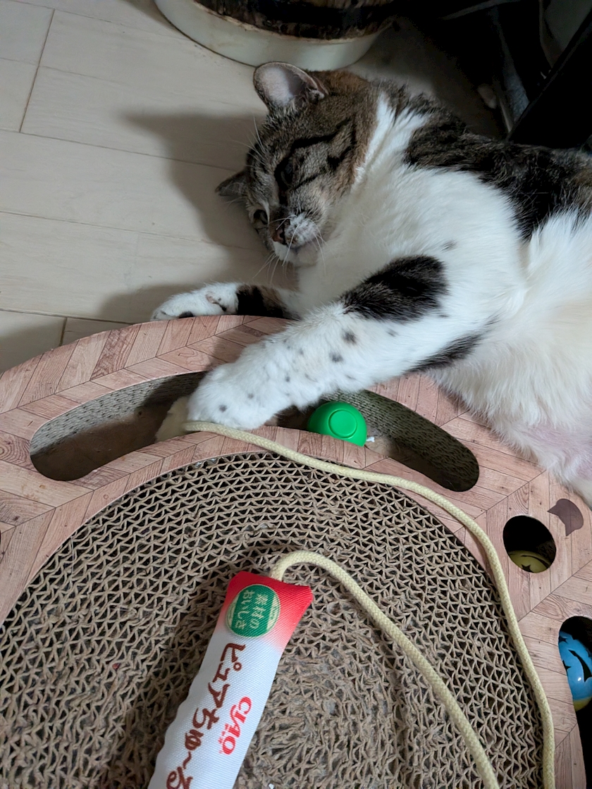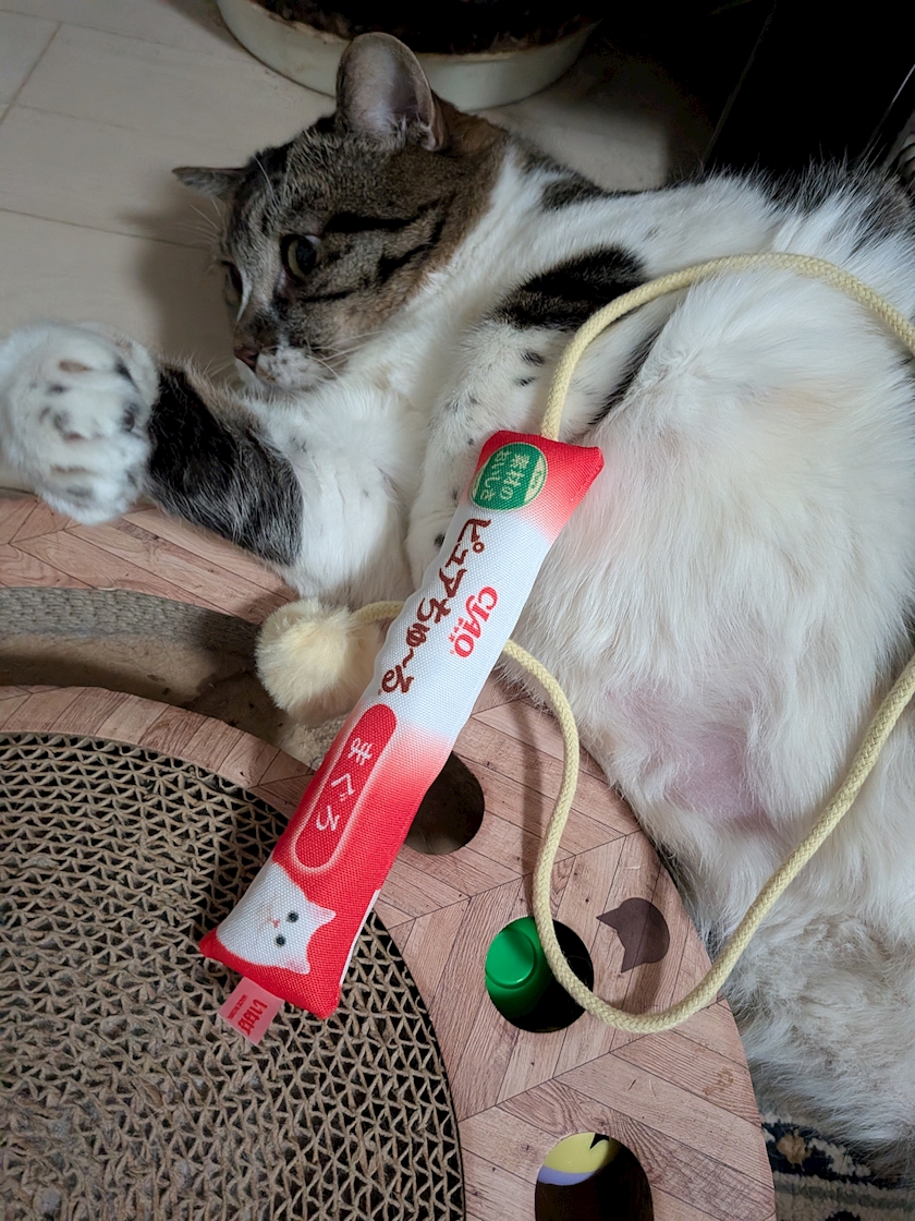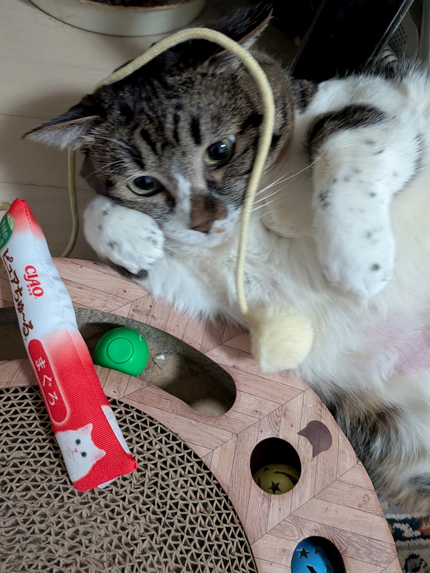 ↑ちゅーるに付いていたおもちゃが気に入ったのか、めっちゃ喜んでいて1人で遊んでいましたー😻