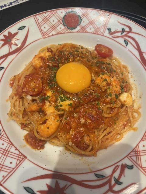 五右衛門パスタの海老とモッツァレラチーズのカルボナーラチリトマトソースだけは大好き