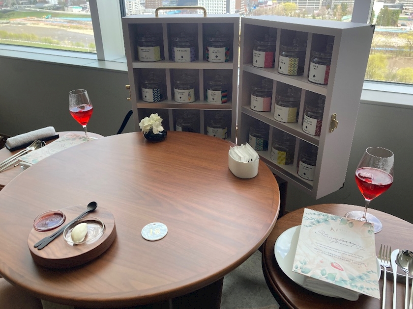 ウェルカムドリンクのストロベリーカクテルを飲みながらどの紅茶にするかお友達と香りを選びながらおしゃべり🤭