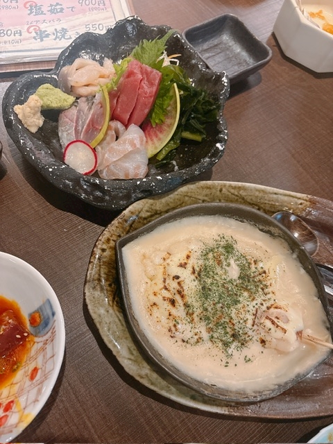 刺し盛りと大好きなえびグラタン串
