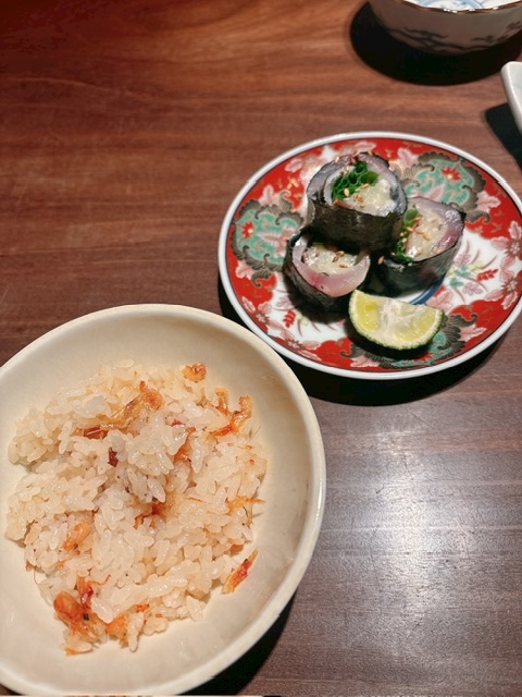 桜海老の炊き込みご飯とガリ鯖巻き