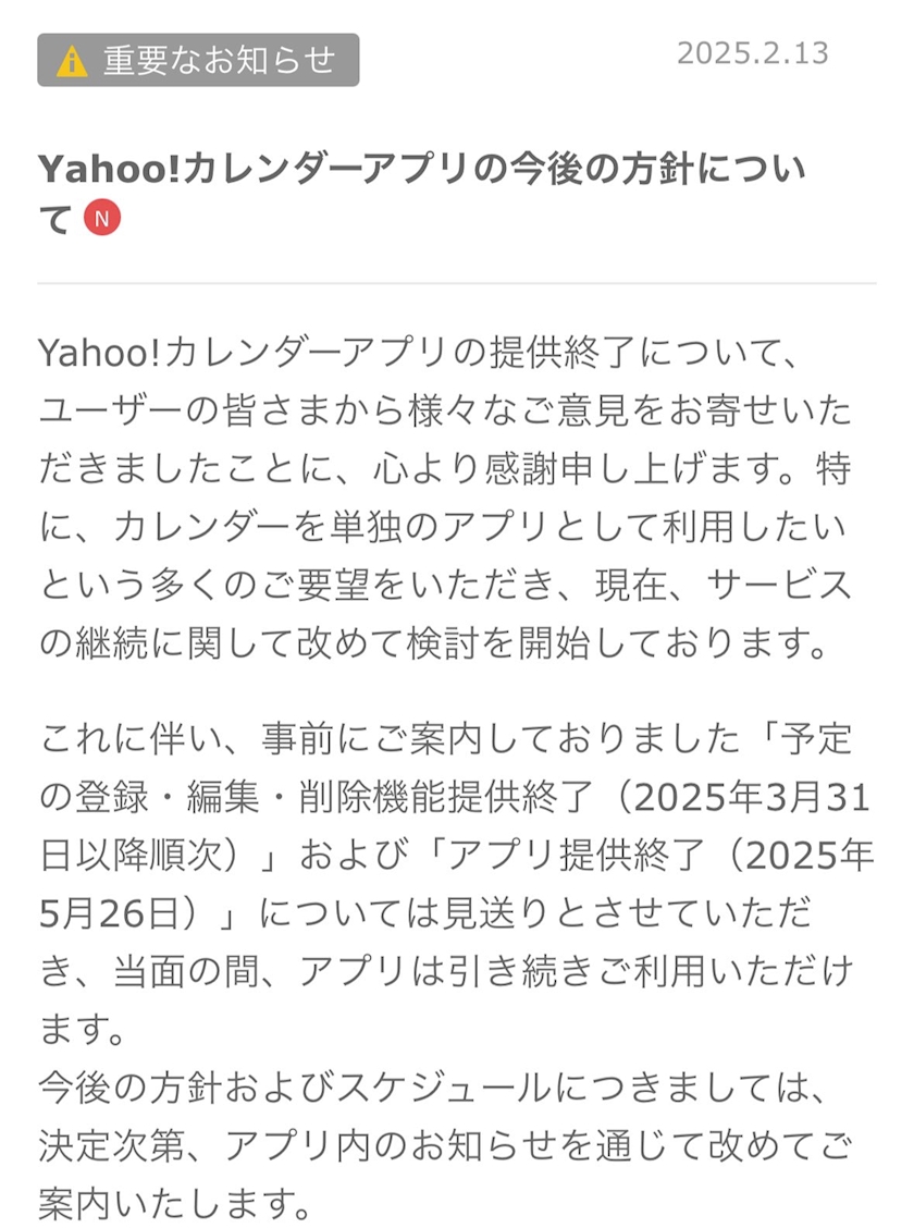 Yahoo!カレンダー使ってるんだけどもうすぐなくなっちゃうらしい🥹🥹