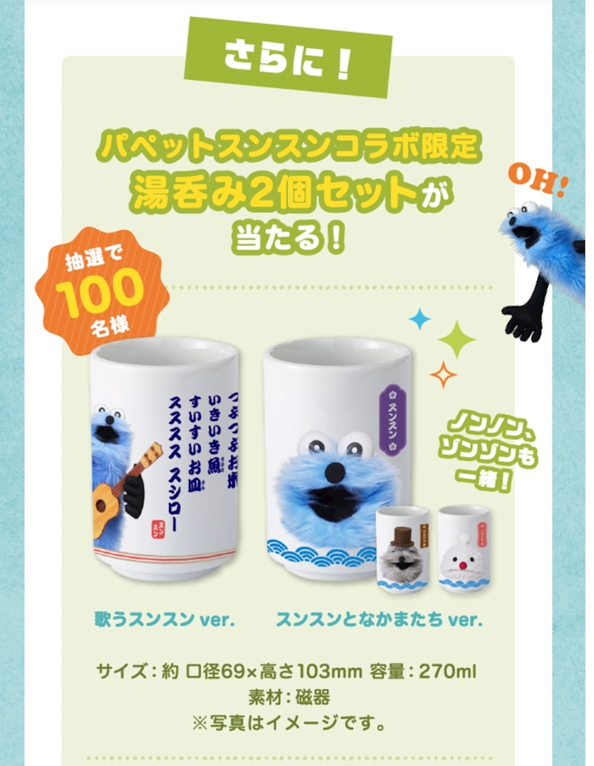 今回のコラボはお寿司とセットになったエコバッグとか抽選で当たる湯呑みがかわいい💖