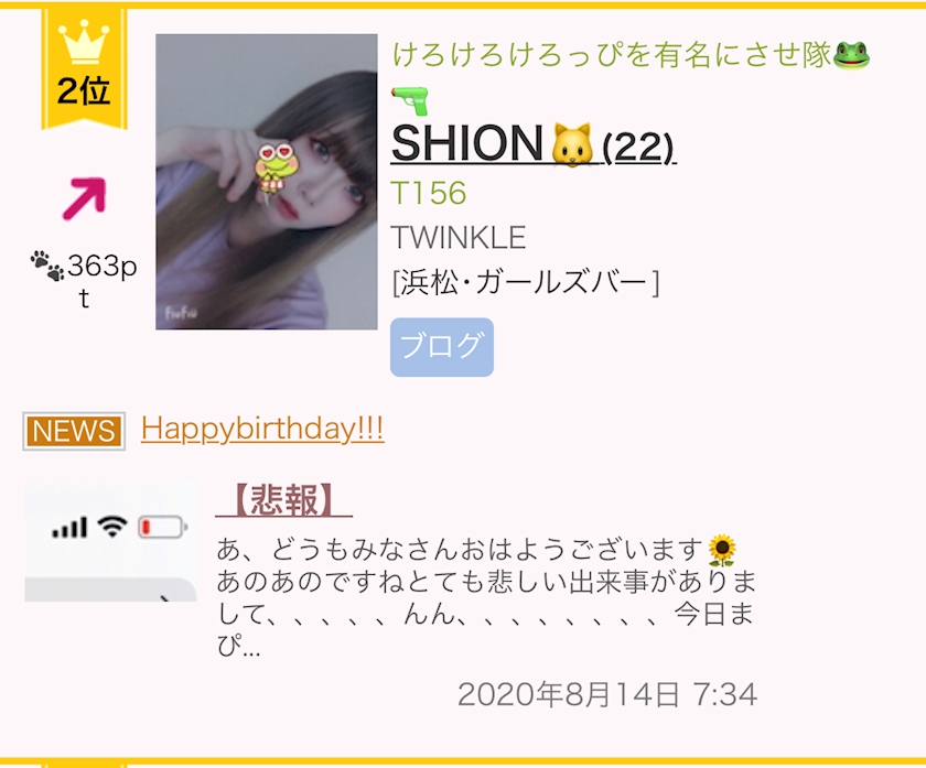 静岡2位!💚💛💚💛 - SHION🐸 - TWINKLE・ティンクル - 浜松のガールズバー