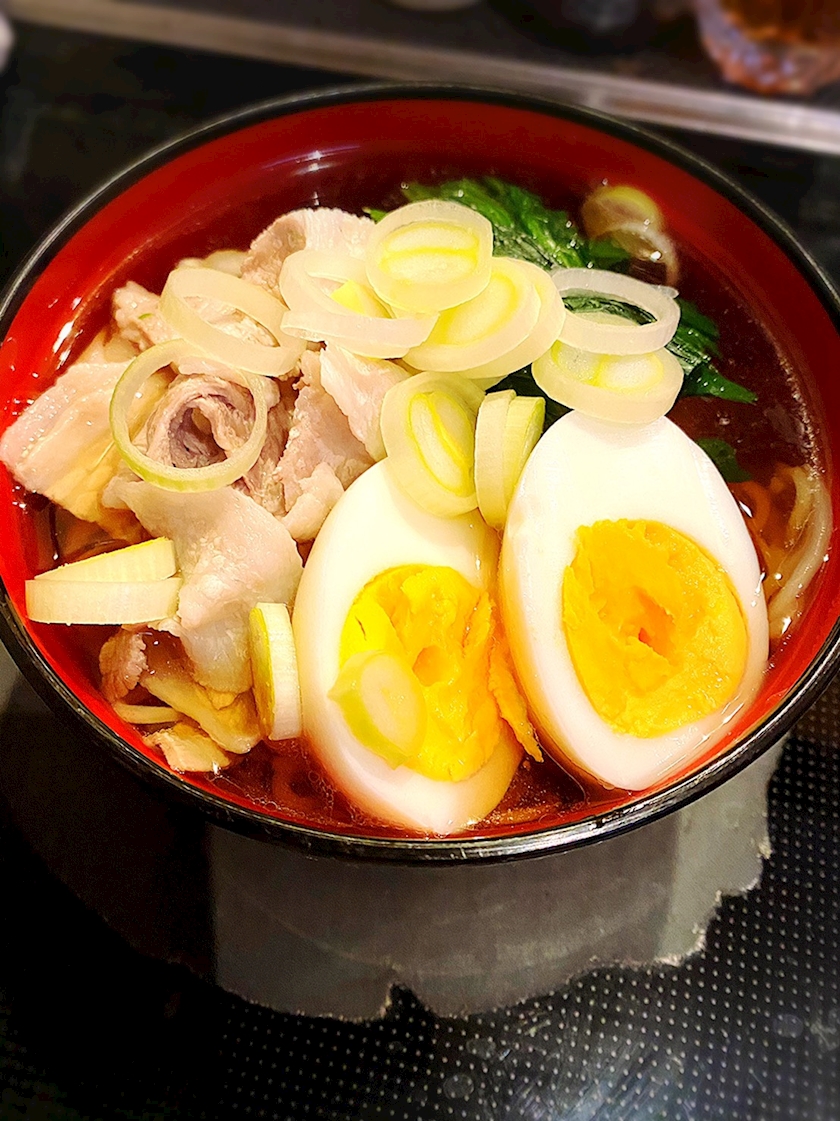 昨日の袋麺に今日はほうれん草と茹で豚バラ、卵とネギ。