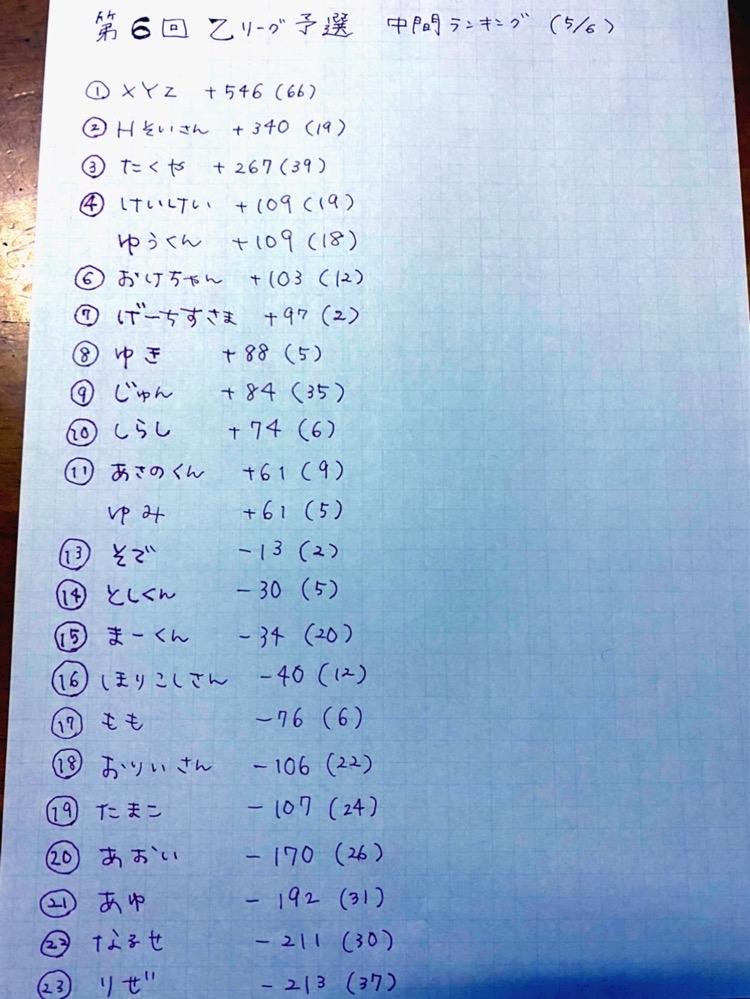 店から乙リーグ予選の集計用紙を持ってきたので集計しました。