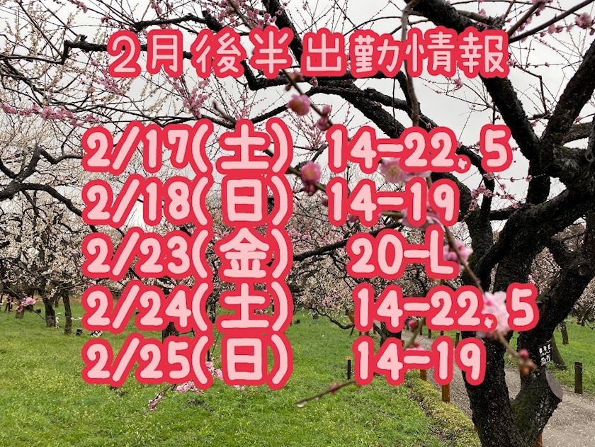 2月後半の出勤情報です!