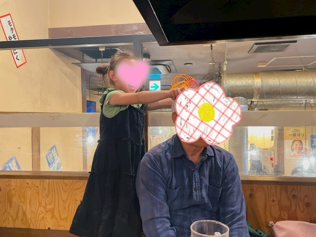姪っ子が父の頭におもちゃを乗せて爆笑してる図