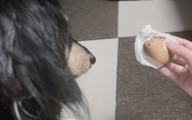 ひよ子を見下す愛犬