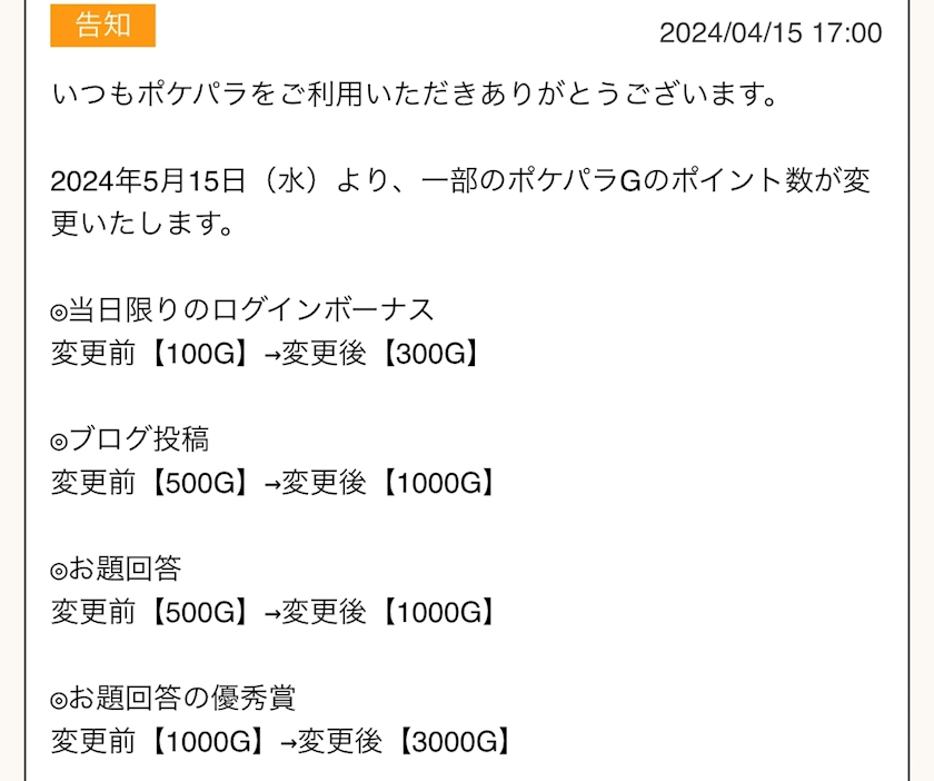 毎日もらえるポケパラGが増えるお知らせ見て嬉しくなった✨