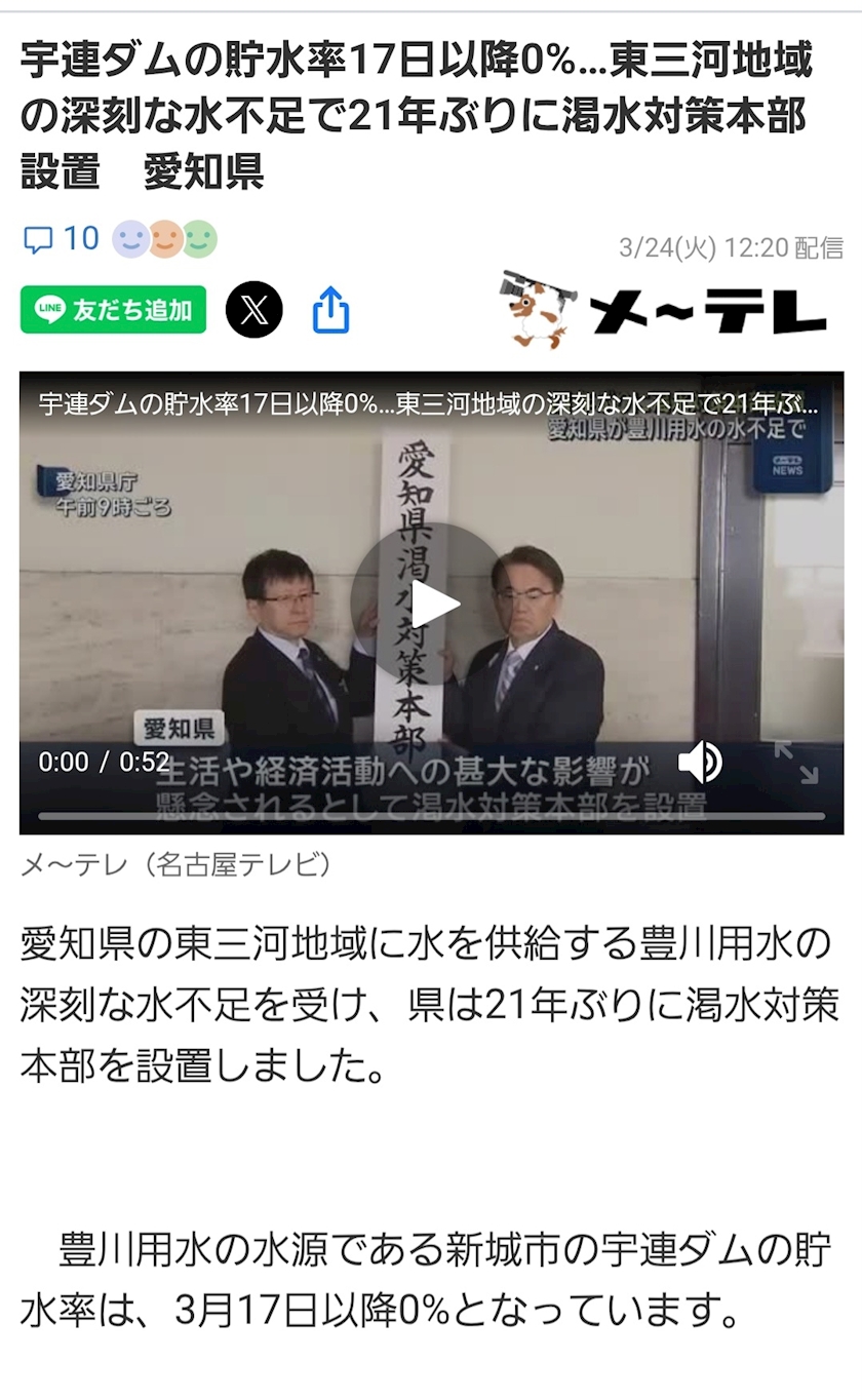 なんか愛知のどっかのダム貯水率0%とか