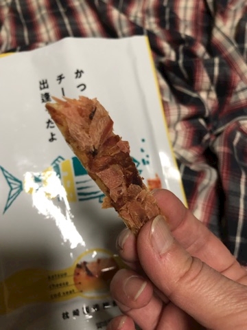 チータラのチーズの上にちょっと粗めの鰹節を乗せてプレスしましたなんだけど