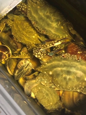ハマグリは酒蒸しに、渡り蟹はお味噌汁にしようかな