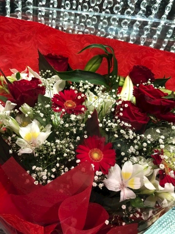 お店にお祝いのお花が届いてます