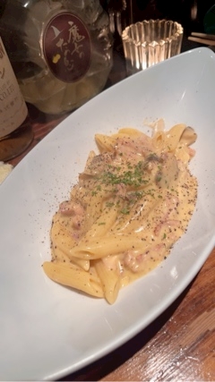 〆はペンネでカルボナーラ
