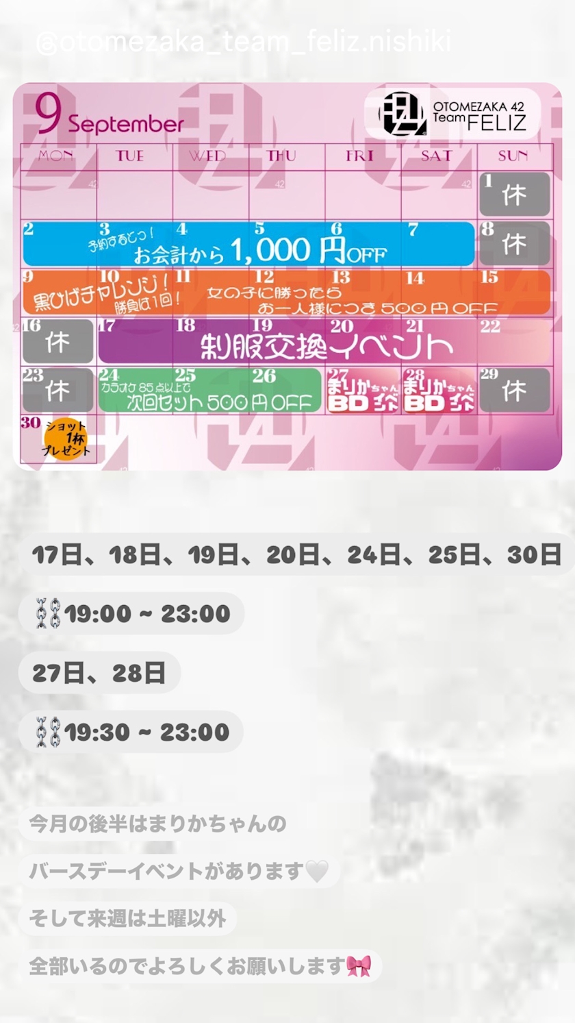 ⛓9月後半の予定🤍 - 🐋 しの 🤍 - FELIZ・フェリス - 名古屋 錦のコンカフェ