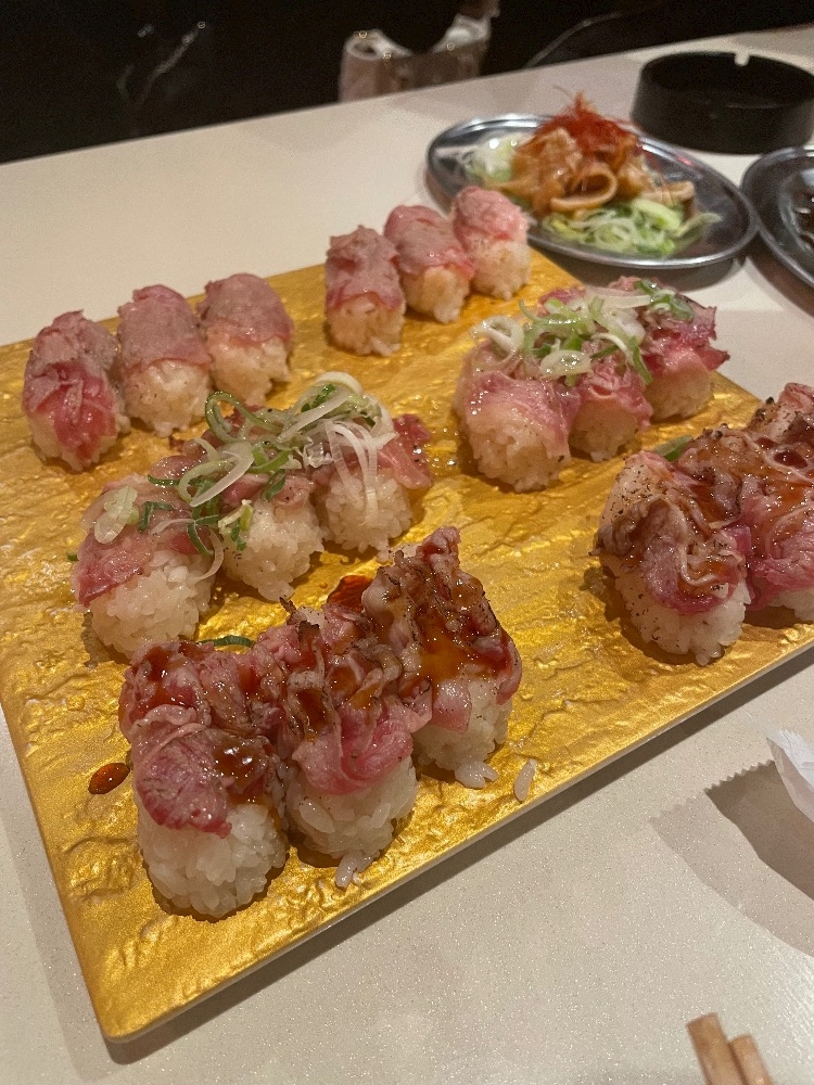 これは居酒屋さんの肉寿司どーん笑