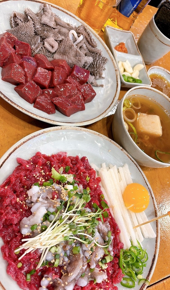 店員のおばさんに小さいサイズをオススメされたものの、BIGサイズのレバ刺し・センマイ刺し・生ユッケ・生きたタコを注文し、瓶ビールで流し込む🍺