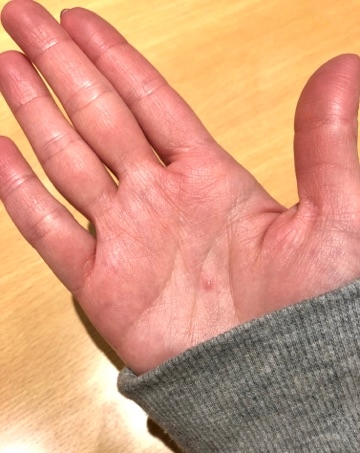こぼして、熱々のジャムを右手でキャッチしてしまい、
