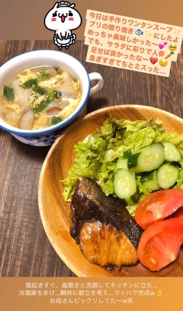 ワンタンスープとブリの照り焼き