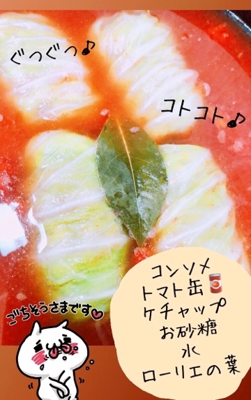 ④キャベツを茹でるときに使った鍋とお湯に、ロールキャベツを入れ、トマト缶・ケチャップ・コンソメ・砂糖・ローリエの葉を入れ、蓋をして煮込む♪