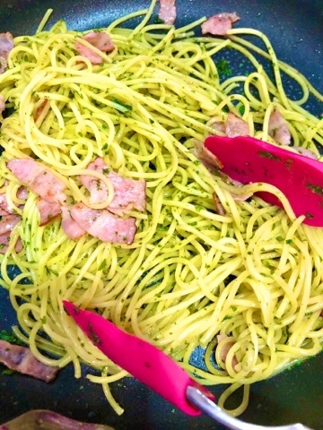 パスタを入れ、絡めたら火を消して、バジルを投入!!すばやく混ぜて、お皿に盛る♪