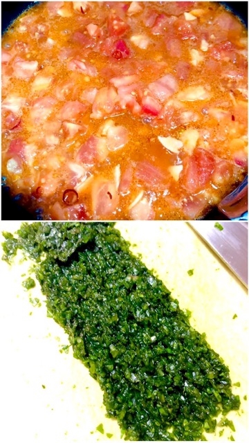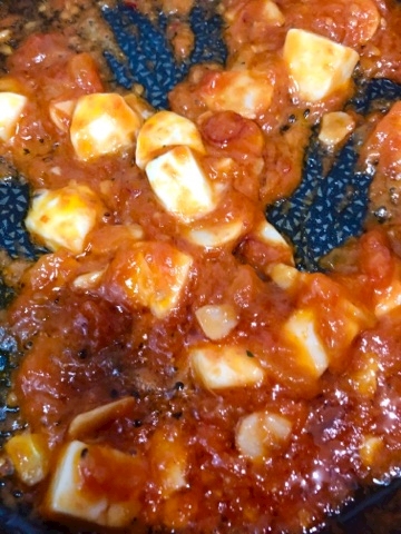 ①オリーブオイルにニンニク・鷹の爪を入れ弱火で香りを出したら、湯むき&カットしたトマト大2個と、コンソメを入れコトコト煮詰め水分を飛ばす。ハーブソルトで味を整え、ソースは完成♪