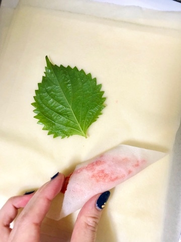 ※コツは、大葉をカニカマから離れた位置に置くと仕上がりが、緑色が綺麗に見えます