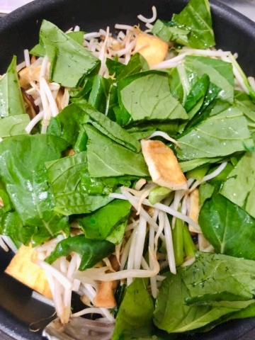 ②小松菜とモヤシをin♪(時差つけて小松菜の葉は最後にいれて素早く仕上げてね)