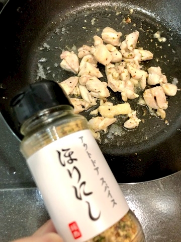 ほりにしで鶏肉を炒める。