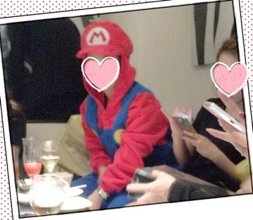 ビンゴでGETしたマリオのコスプレを着るメグちゃん。