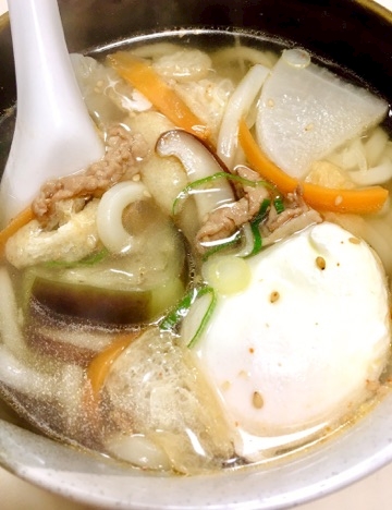 カットして冷凍しといた具→大根,人参,茄子,ネギ,豚肉,油揚げ,