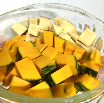 ①カボチャと薩摩芋を耐熱皿でチン