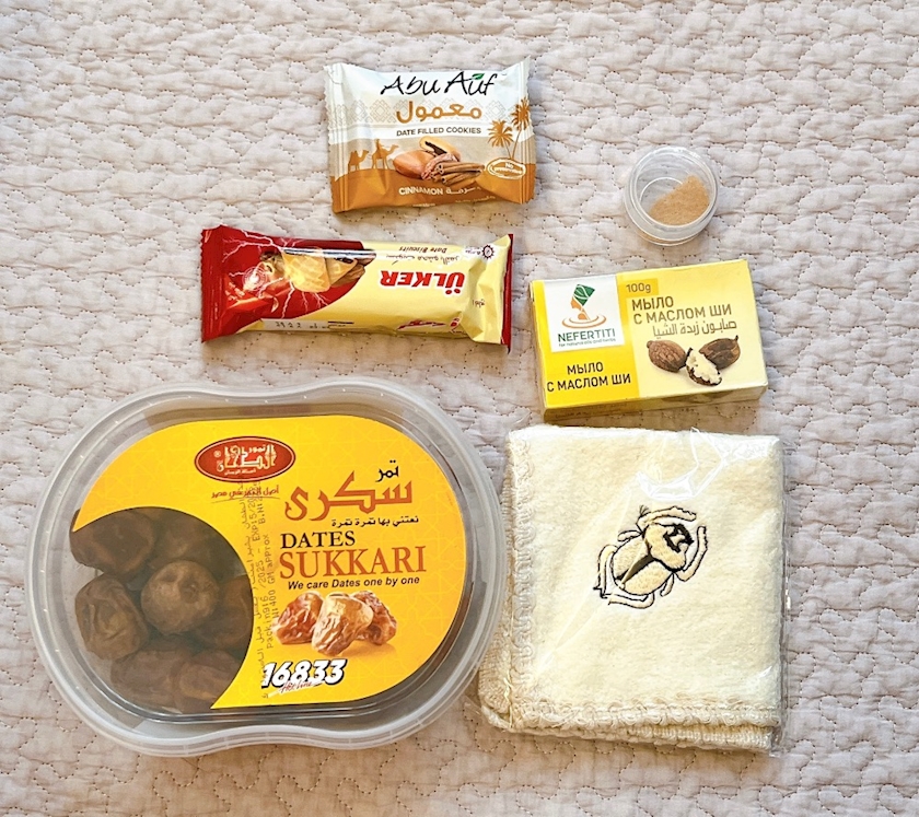 石鹸やスカラベのハンカチ、お菓子、