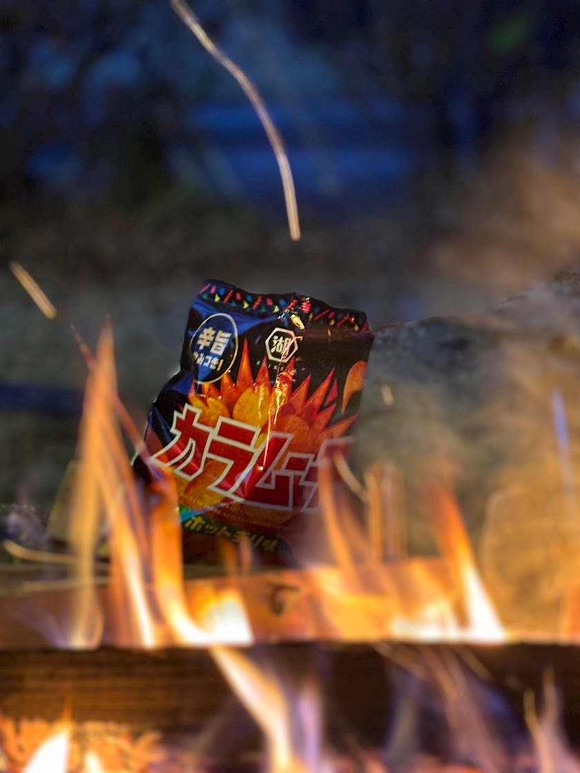 写真は焚き火の向こうの