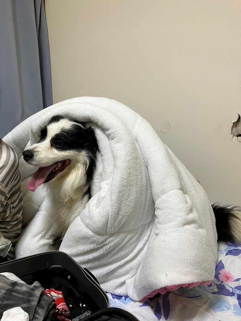 その後お家の中でちょっとの間自由時間嬉しそうにしてて私が寝てるベッドのお部屋に行ったら着いて来て何をするんかと思たらお布団に匂い付け😵