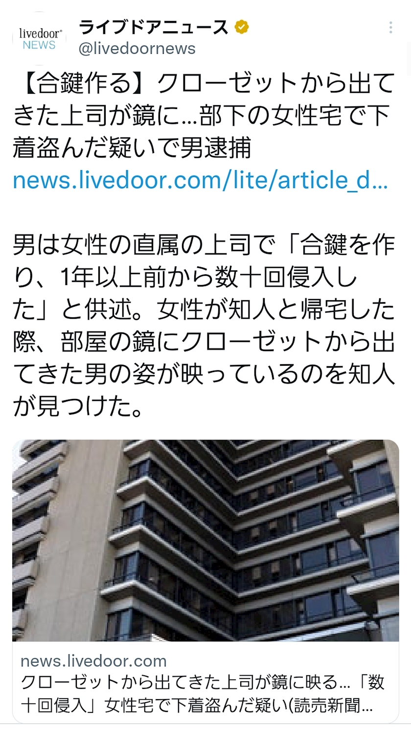 なにより「女性が知人と帰宅した際、部屋の鏡にクローゼットから出てきた男の姿が映っているのを知人が見つけた」の1文怖すぎでしょ((( ;゚Д゚)))