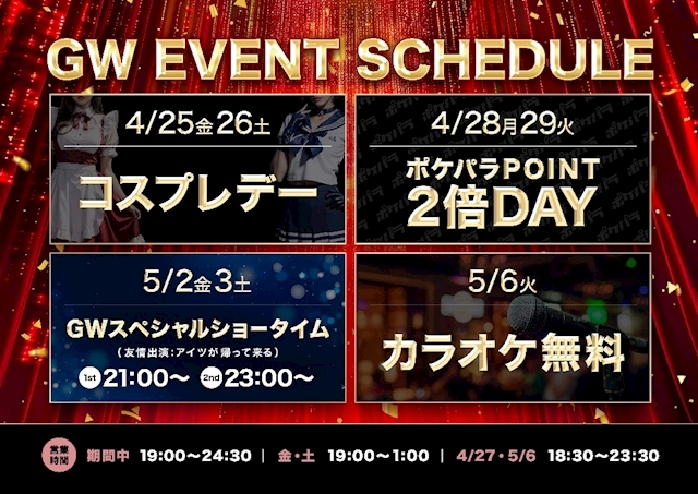 19:00~0:30 (金・土は1:00まで営業) ※日・祝日は18:30~23:30 (祝前日の場合は除く) |