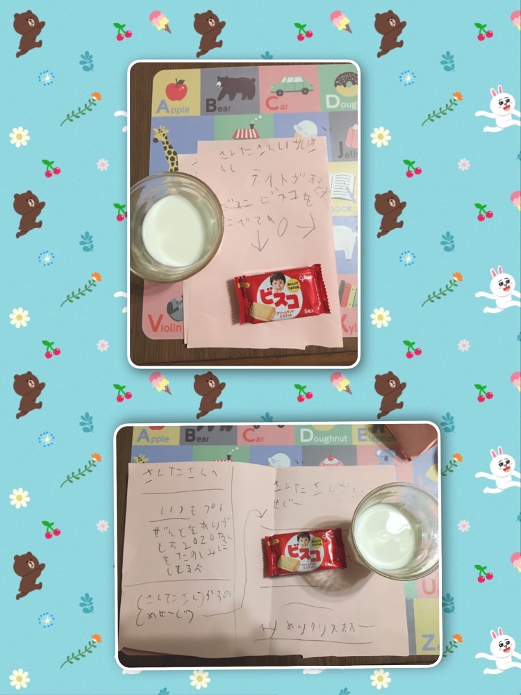 昨日、帰ってきてからよっぱらいみおサンタは息子が書いたサンタさんへの手紙を読み、お返事を書いてミルクとビスコを食べ、プレゼントをラッピングして枕元へ