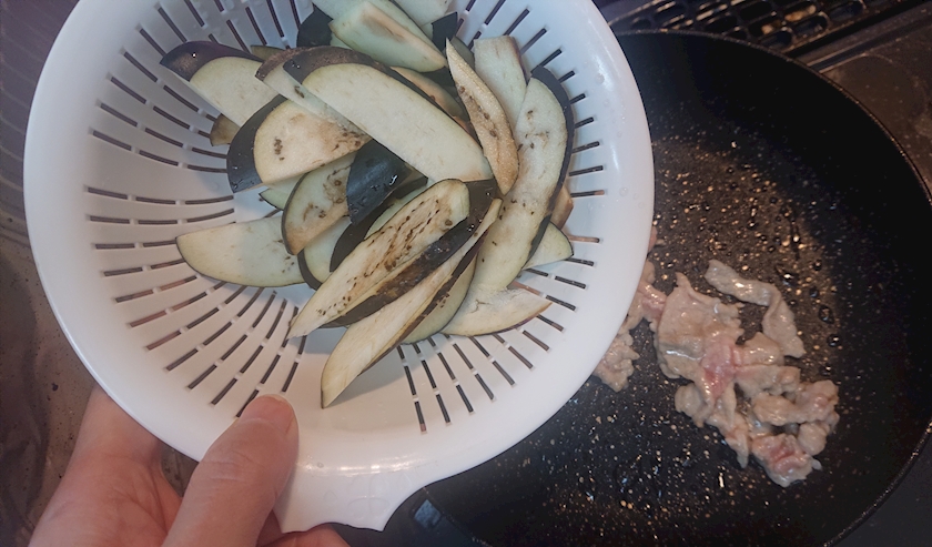 水を切ったナス入れて
